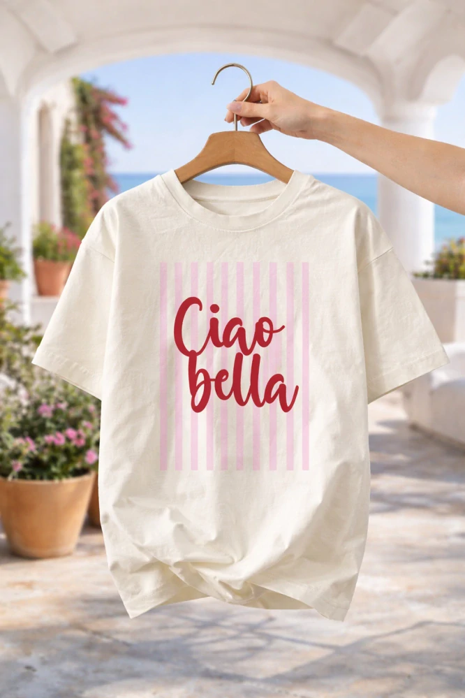 Ciao Bella! Malý pozdrav, výnimočný pocit. Tričko, ktoré vonia letom v Taliansku, rannou kávou na námestí a morským vánkom ovievajúcim tvoju tvár. Hravý, ženský nápis v ružovej farbe je jasným komplimentom...pre teba, ale aj pre svet okolo.